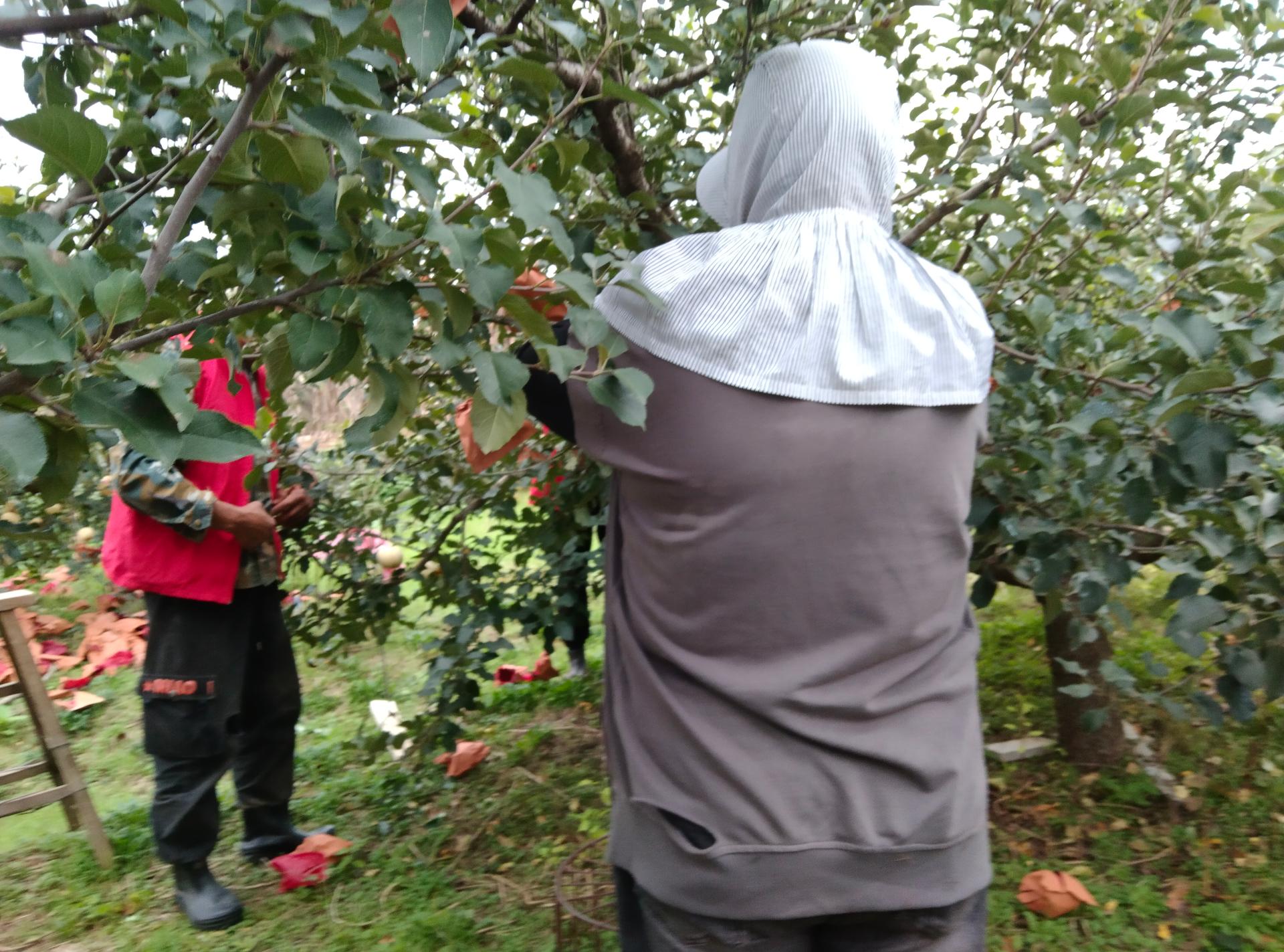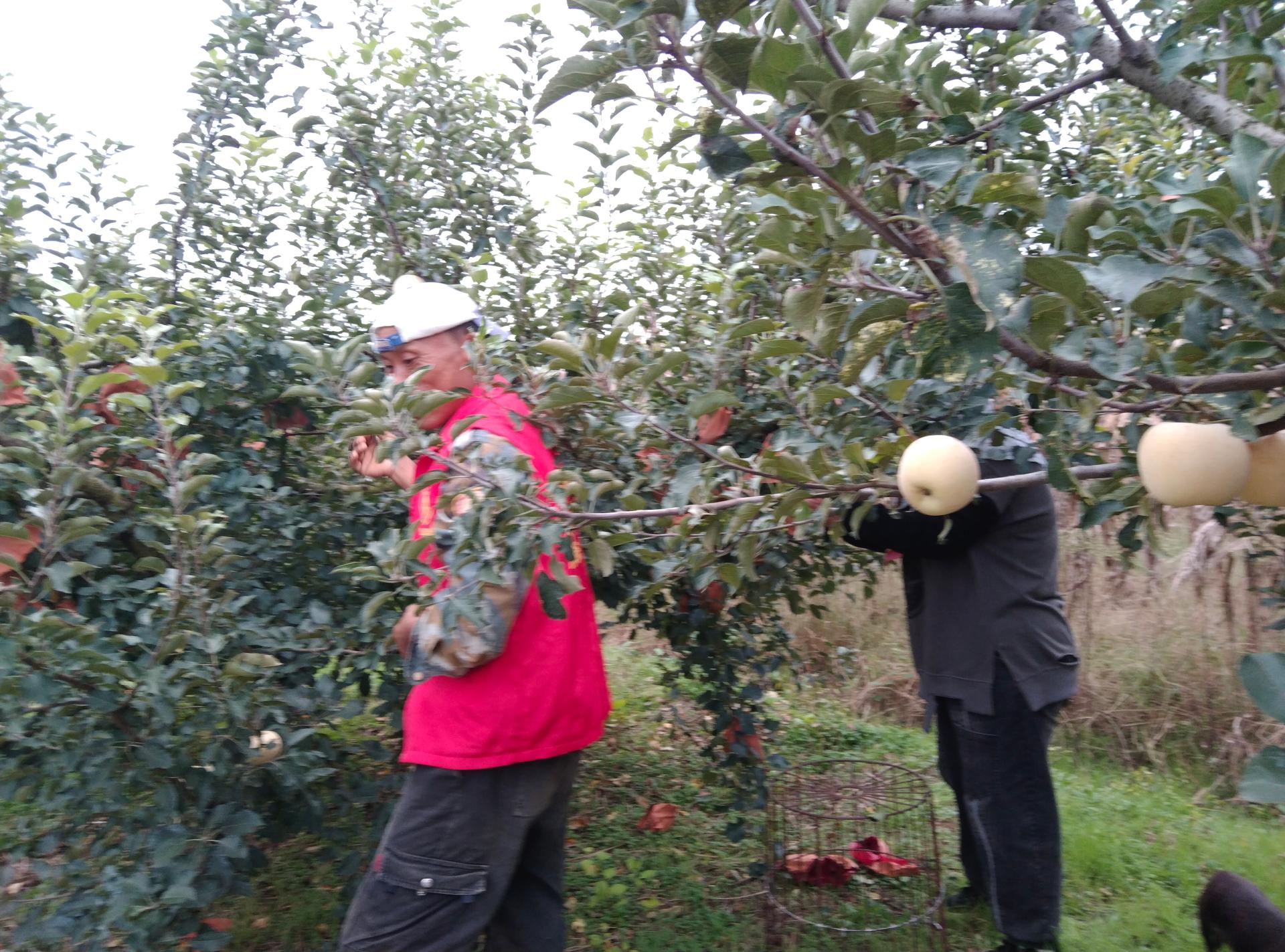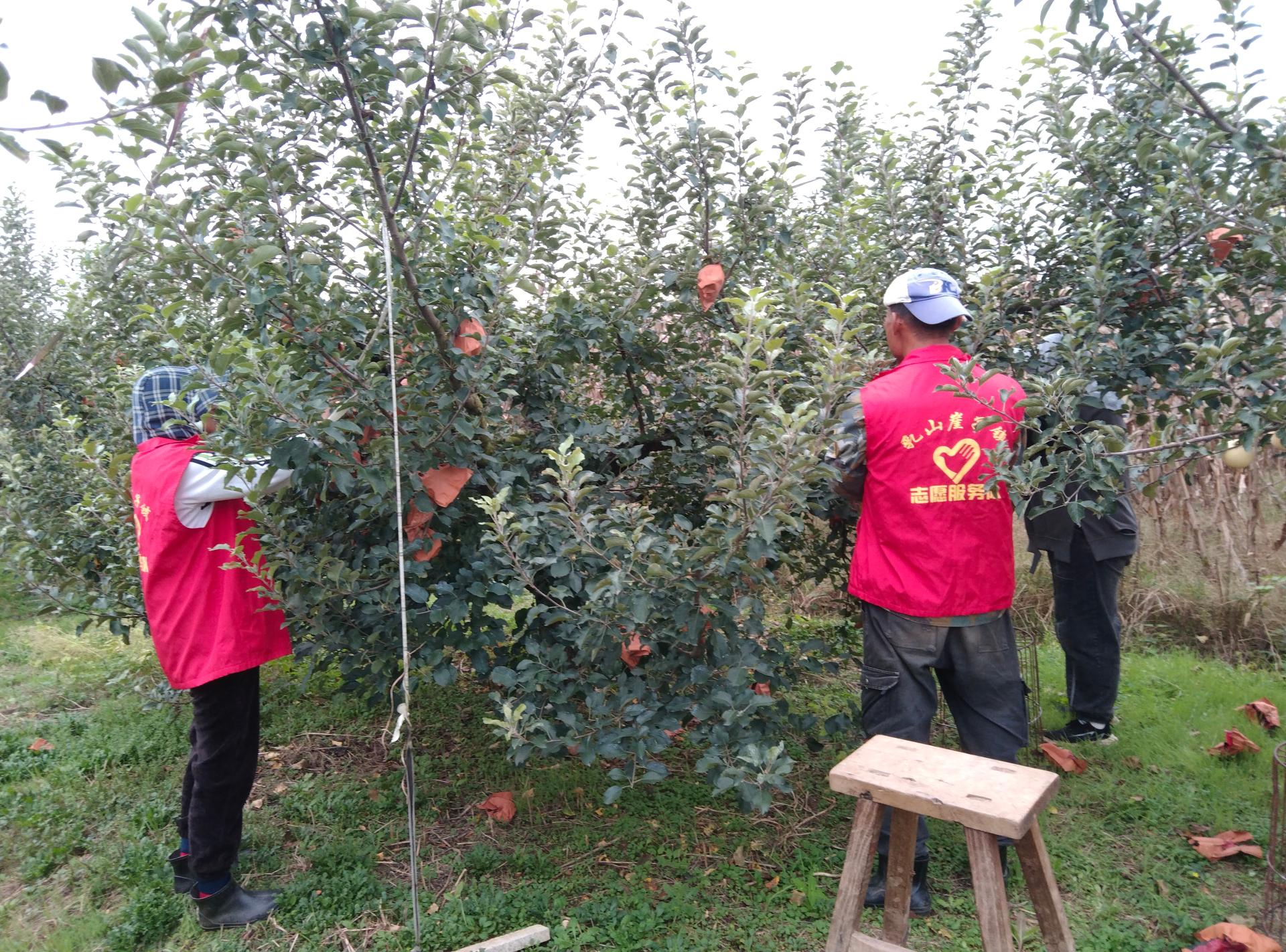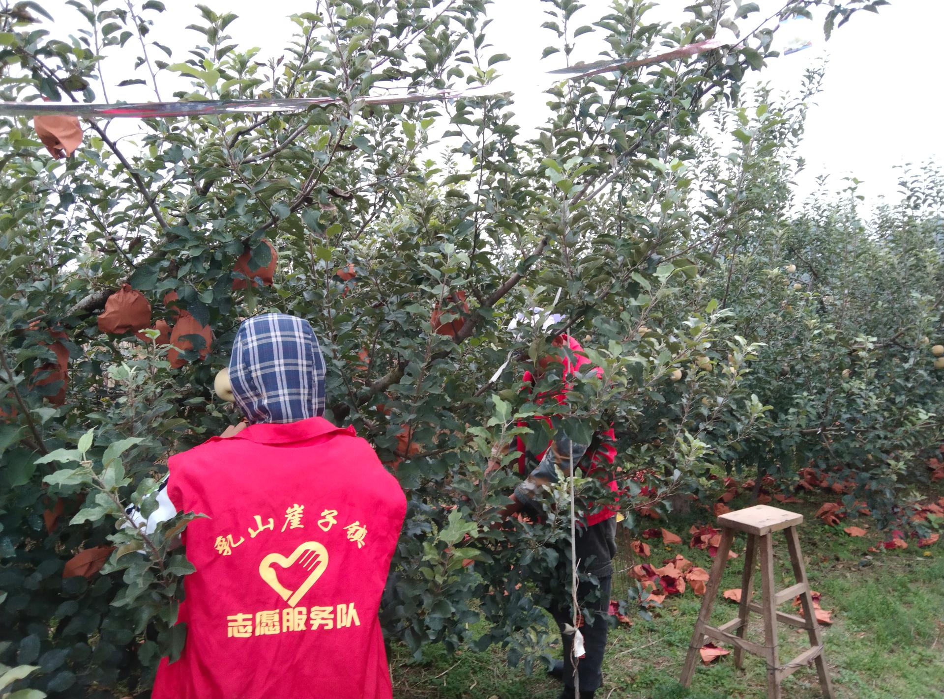 2025年10月14日上午,乳山市崖子镇炉上村,因为天气问题,志愿服务岗人员帮助村里老人摘苹果内袋外袋。